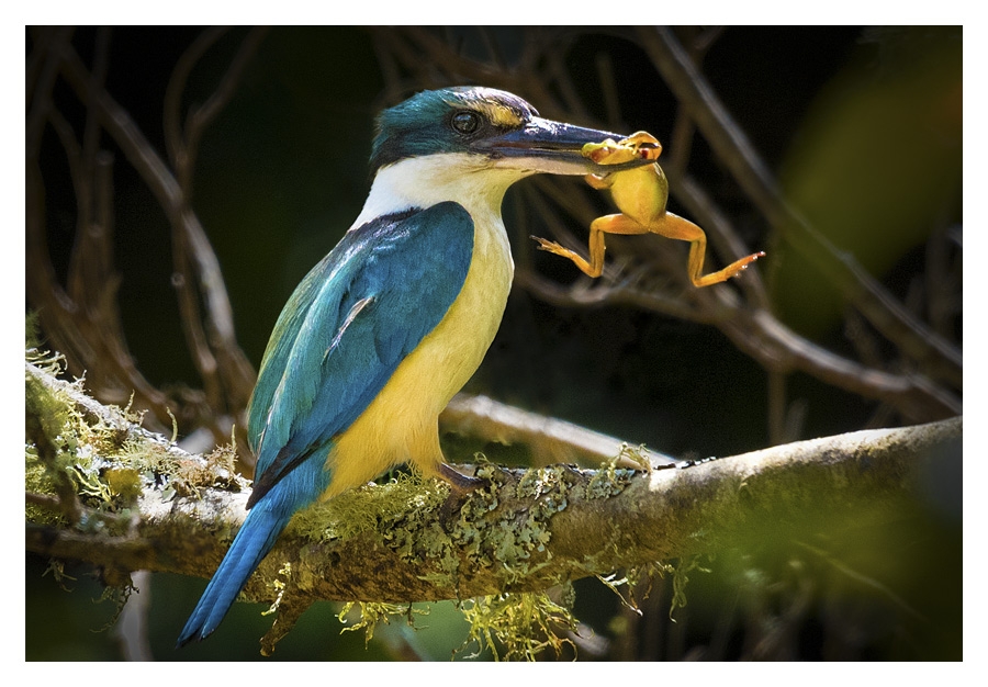 The settlement of New Zealand has greatly benefited the Kotare (as with the Tui) by the incidental providing of a broader range of food and nesting opportunities. Sometimes, though, it raises the ire of householders with its robbing of Goldfish from garden ponds and pecking of chunks from ripening orchard fruit, which it feeds to its young. This frog, once dispatched, will be swallowed whole...